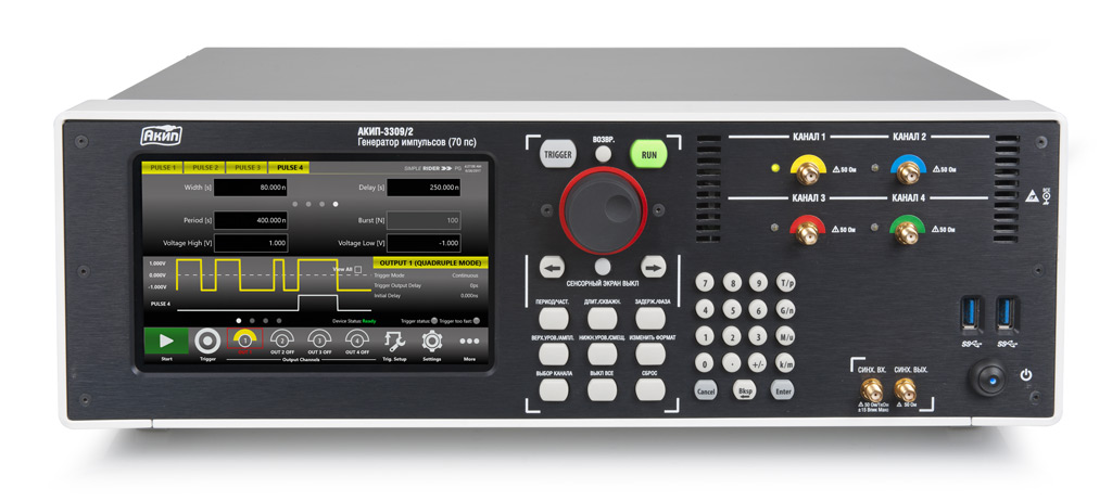 Генератор импульсов АКИП-3309/2 создает сигнал определенной формы, который используется при настройке электронных схем, широкополосного и импульсного радарного оборудования.