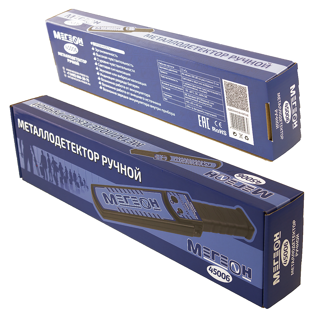 МЕГЕОН 45006 — это ручной досмотровый металлодетектор, предназначенный для обеспечения безопасности различных объектов и мероприятий. Старшая модель имеет улучшенный алгоритм детектирования и более высокие эксплуатационные характеристики. Прибор сочетает в себе эргономичную форму, небольшие размеры и вес, непревзойдённую чувствительность с возможностью загрубления. Возможна работа от батареи, аккумулятора или внешнего сетевого адаптера, который одновременно является зарядным устройством. Выдающиеся результаты достигаются согласованностью параметров и добавления некоторых дополнительных функций. Высокоточная обработка сигналов с датчика повышает надёжность срабатывания. В нём предусмотрена световая и звуковая сигнализация тревоги, при необходимости звук можно переключить на вибросигнал. Кроме предметов из стали и железа, детектируются изделия из других металлов.